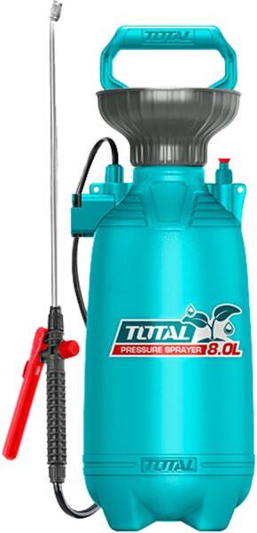 Nyomásos szórófej, 8L, 2,5 BAR. Tartályűrtartalom: 8L, Biztonsági nyomáscsökkentő szelep, Praktikus hordpánt, Erős alumínium pumpakar, Nyomás: 2,5 bar, 1,2 m hosszú flexibilis tömlő, Rozsdamentes acél rúd és fúvóka, BE/KI kapcsoló reteszelővel, Állítható szórófej. Tömeg 1,6 kg. TOTAL márka.